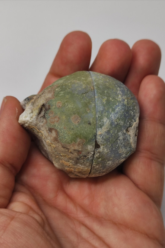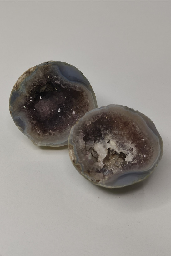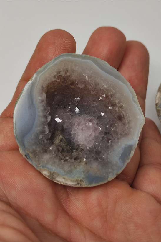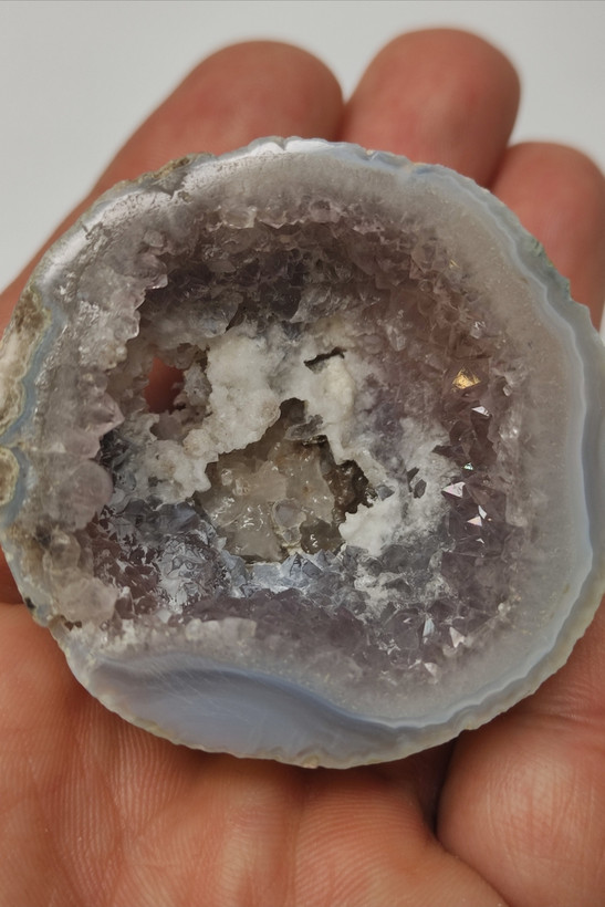 سنگ توپی ژئود آمیتیست طبیعی با همرشدی بلورهای کلسیت و حاشیه عقیق سلیمانی برش خورده و پولیش شده بسیار زیبا با تشکر گالری تیرازیس