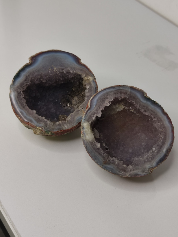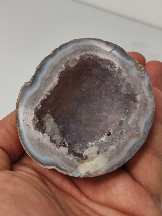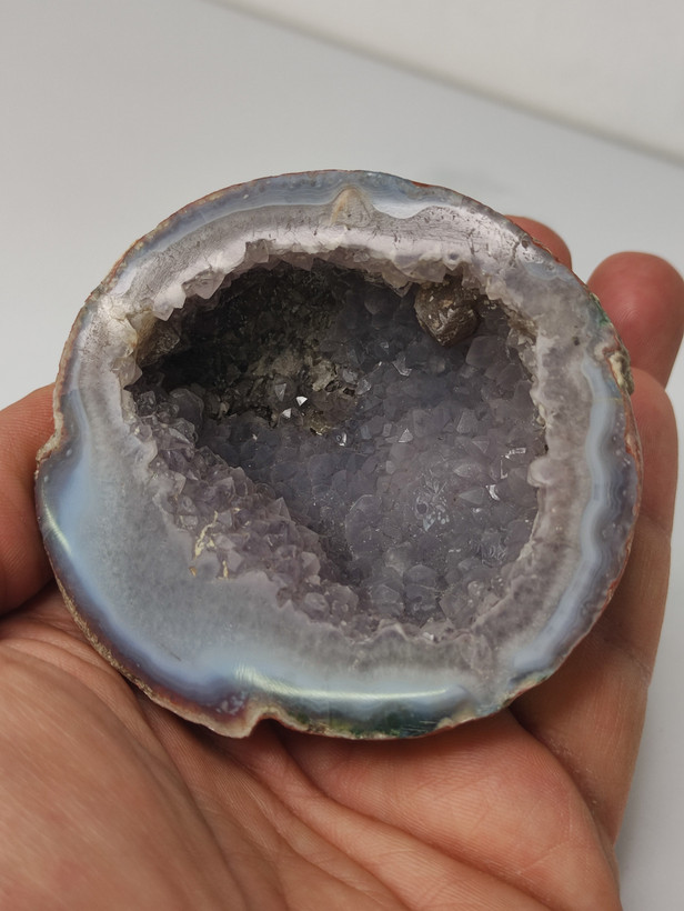 سنگ توپی ژئود آمیتیست طبیعی با همرشدی بلورهای کلسیت برش خورده و پولیش شده بسیار زیبا و دیدنی با تشکر گالری تیرازیس