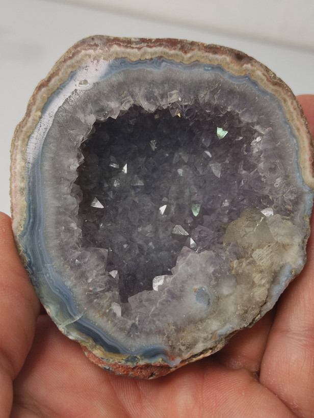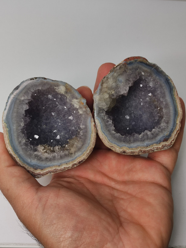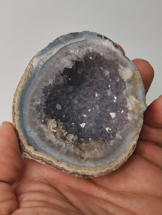 سنگ توپی ژئود آمیتیست طبیعی کلکسیونی با همرشدی بلورهای کلسیت برش خورده و پولیش شده بسیار با کیفیت و درخشان با تشکر گالری تیرازیس