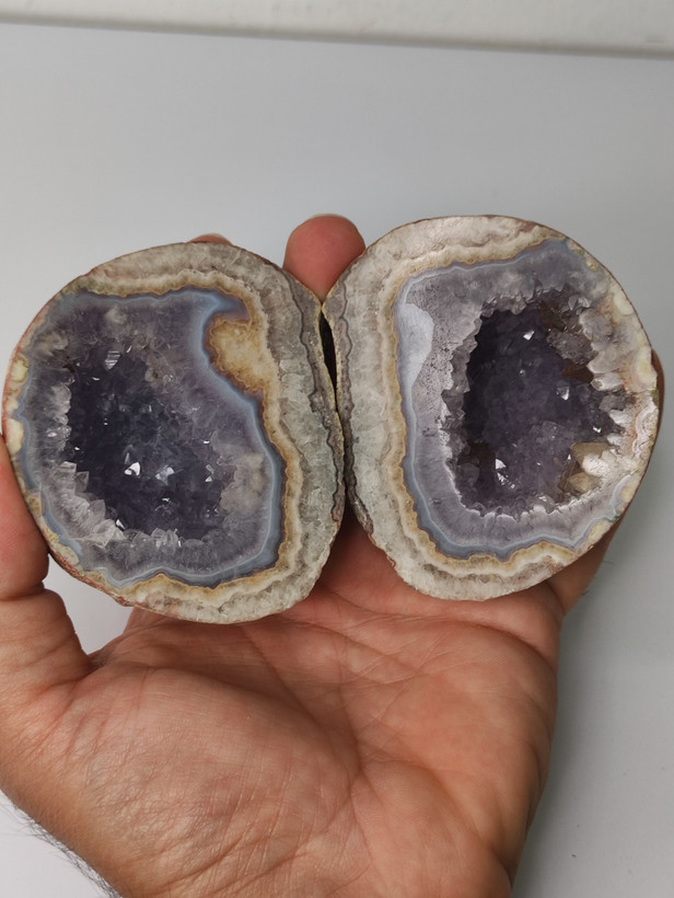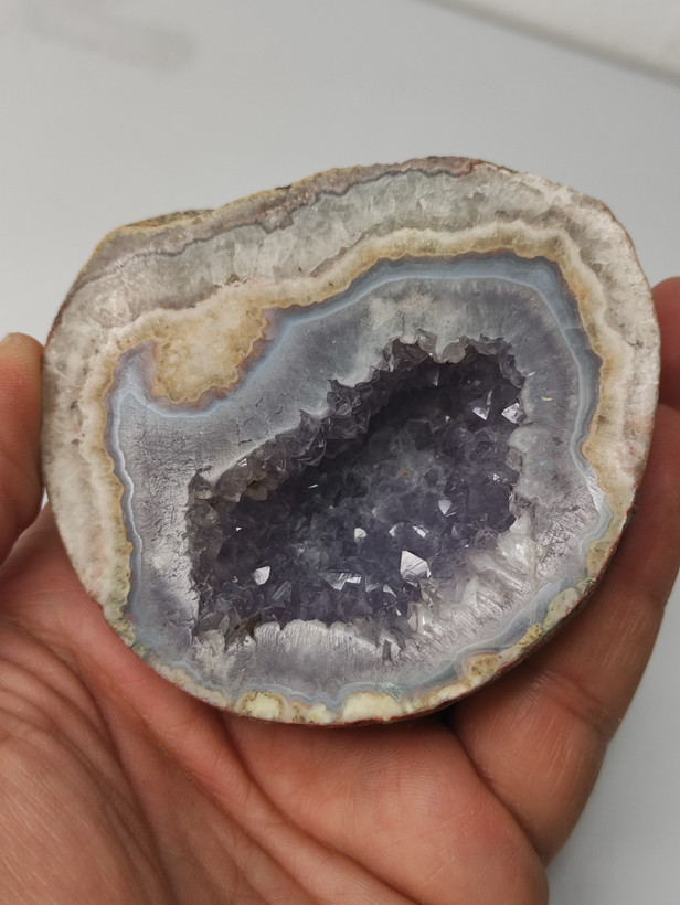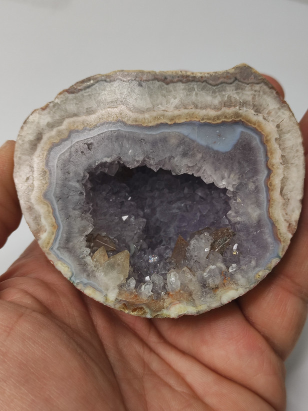 سنگ توپی ژئود آمیتیست طبیعی با همرشدی بلورهای کلسیت برش خورده و پولیش شده بسیار با کیفیت خوشرنگ و بلورهای درخشان با تشکر گالری تیرازیس