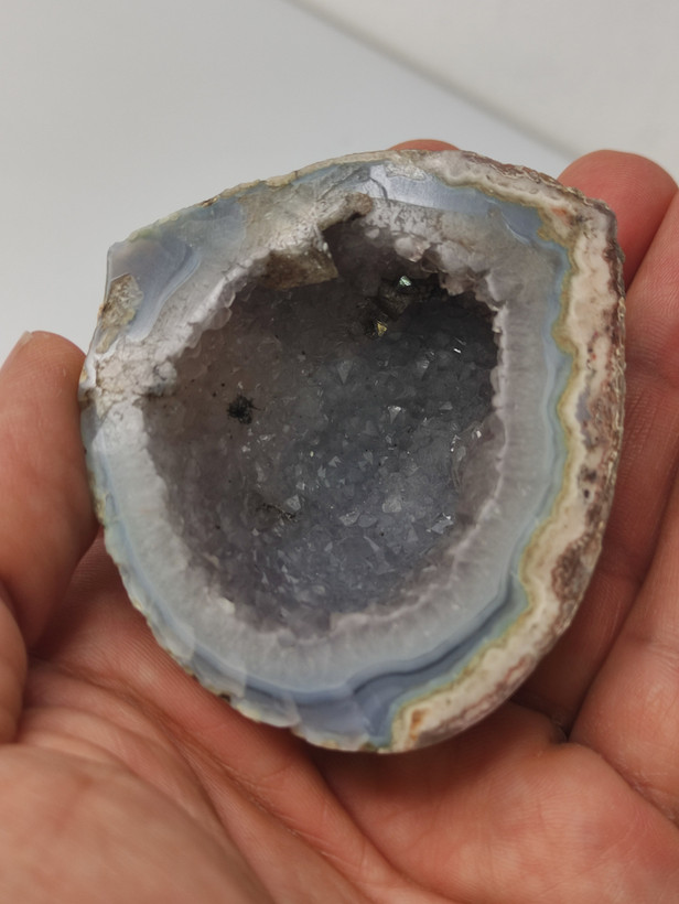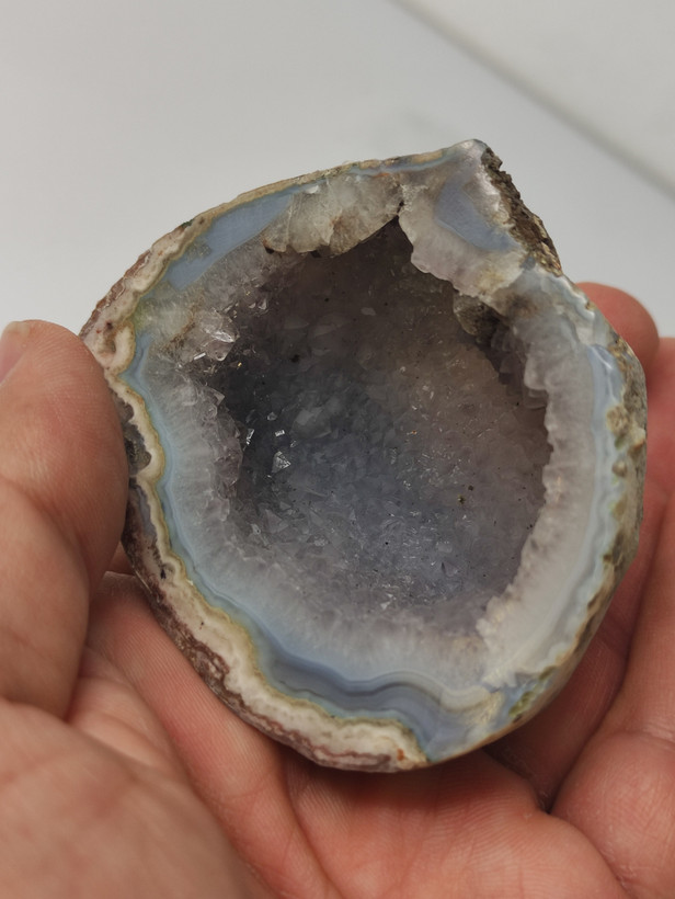 سنگ توپی ژئود آمیتیست طبیعی با همرشدی بلورهای کلسیت برش خورده و پولیش شده بسیار زیبا و خاص با تشکر گالری تیرازیس