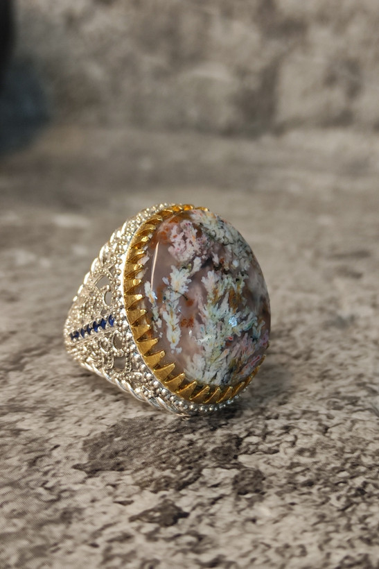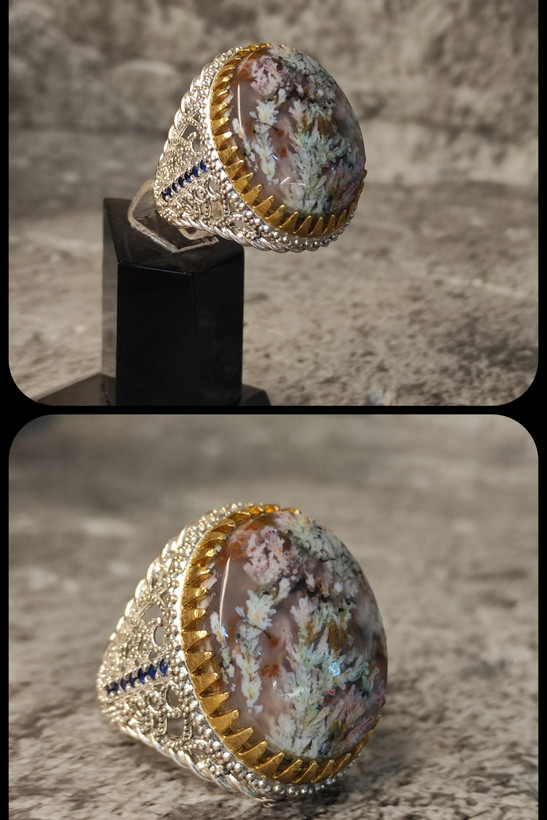 انگشتر نقره 925 مردانه با نگین عقیق شجر بهاری هفت رنگ بسیار زیبا و خاص با تشکر گالری تیرازیس