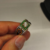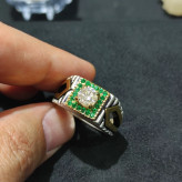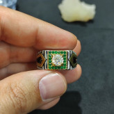 انگشتر نقره مردانه با طراحی خاص و نگین درخشان مویزنایت و مخراجکاری زمرد سنتتیک این انگشتر با رکاب نقره عیار 925 و طراحی ترکیبی و سیاه قلم زنی شده جلوه ای بسیار لوکس و خاص دارد نگین این اثر مویزنایت تراش برلیان است با درخشش بسیار بالا جلوه ای مشابه به الماس دارد سایز 61-62 استایلی کلاسیک و رسمی هدیه ای مناسب آقایان خاص پسند با تشکر گالری تیرازیس