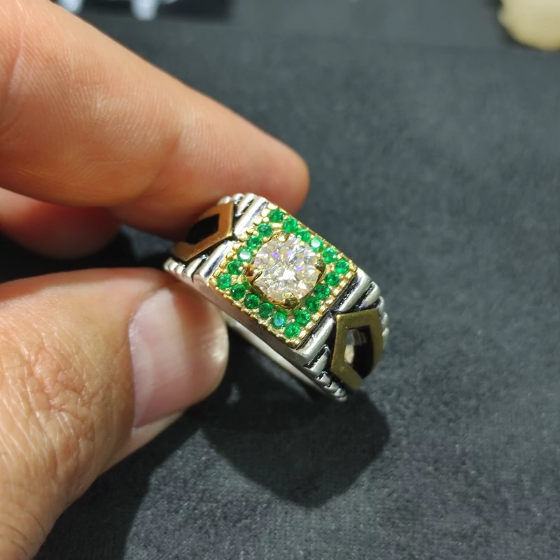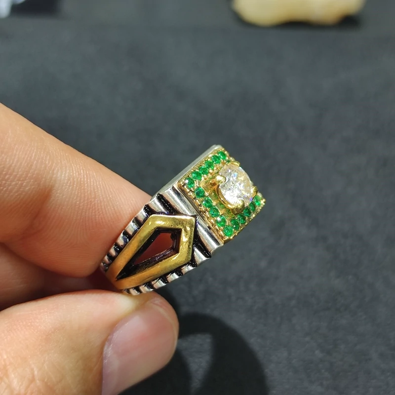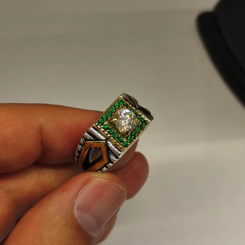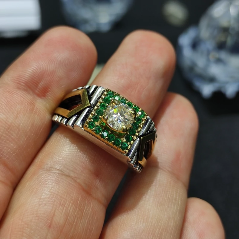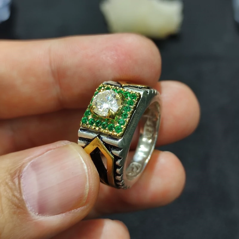 انگشتر نقره مردانه با طراحی خاص و نگین درخشان مویزنایت و مخراجکاری زمرد سنتتیک این انگشتر با رکاب نقره عیار 925 و طراحی ترکیبی و سیاه قلم زنی شده جلوه ای بسیار لوکس و خاص دارد نگین این اثر مویزنایت تراش برلیان است با درخشش بسیار بالا جلوه ای مشابه به الماس دارد سایز 61-62 استایلی کلاسیک و رسمی هدیه ای مناسب آقایان خاص پسند با تشکر گالری تیرازیس